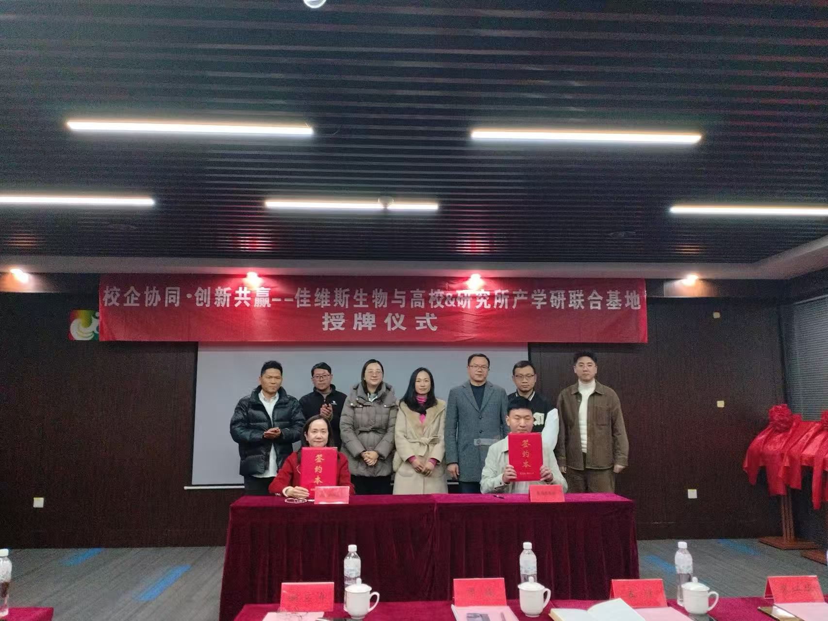 签约揭牌仪式上,周俊、廖兴华与佳维斯生物姚应涛、杨涛为“研究生联合培养基地”揭牌;孟佳、徐红薇与佳维斯生物田根根、徐健壹、谭星宇为“实习实训基地”揭牌,最后合影留念。
